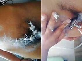 Slender Indian girl has hairy muff shaved by lover in the bathroom