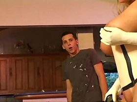 Busty housewife Danielle facesitting a tiny boy