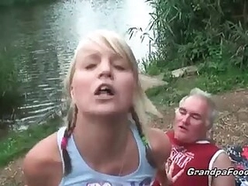 Gorgeous blonde babe rides dick on the river shore